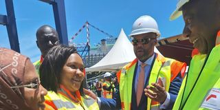 Kenya's Cabinet Secretary for Investments, Trade and Industry (second left) with South African President Cyril Ramaphosa (right) at the port of Durban on January 31, 2024 during the launch of the first consignment of goods to Kenya under the Africa Continental Free Trade Area. PHOTO | MINISTRY OF TRADE via X